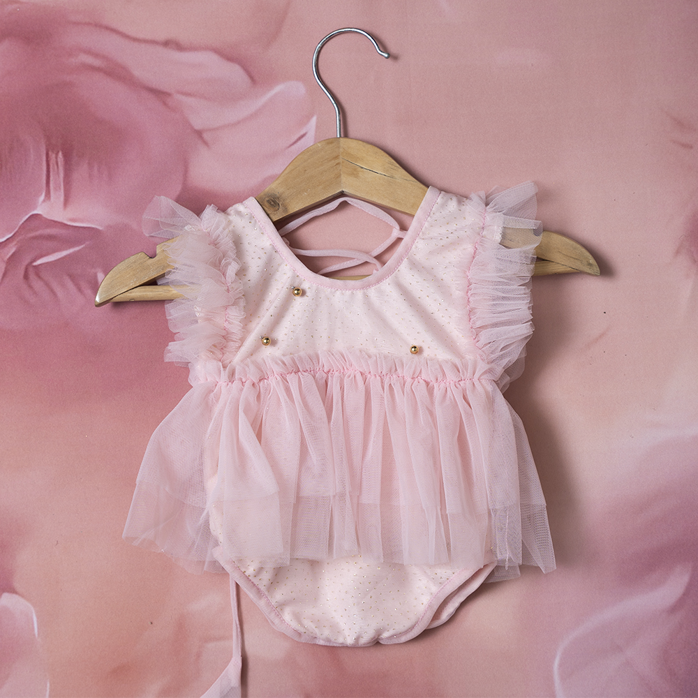 Adorable flutter romper With Lace Details. We have taken utmost care in designing the product, keeping in mind the safety of little ones of your client. We are here to sell our best results.